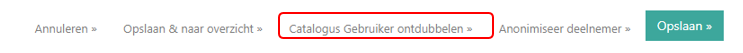 Scroll op de detailpagina naar beneden. Onderaan de pagina vind je de optie ‘Catalogus gebruiker ontdubbelen’. Klik hier op (Let op! Deze optie zie je alléén als je de benodigde rechten hebt in jouw backoffice account.)
