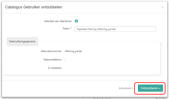 De gebruikersgegevens worden ter controle nog eens getoond in de pop-up. Is dit de juiste gebruiker, dan kun je klikken op ‘Ontdubbelen’.