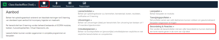 Nadat je bent ingelogd in de backoffice, kies je via het hoofdmenu de optie ‘Aanbod > Beoordeling & Reacties’.