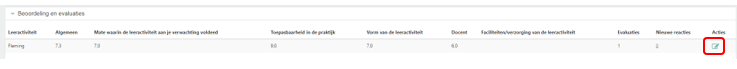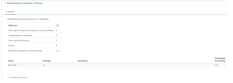 De evaluatiedetails van de leeractiviteit worden onder het overzicht getoond ‘Beoordeling en evaluaties: <naam leeractiveit>. Alle evaluaties worden in een overzicht getoond.