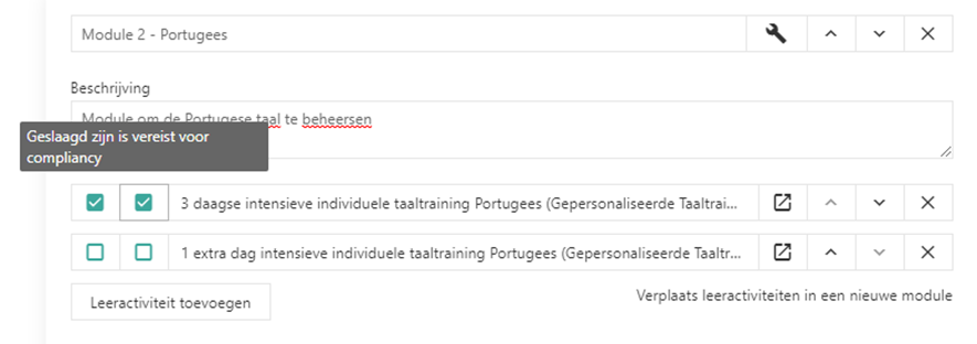 Met de instelling ‘Geslaagd zijn is een vereiste om compliant te zijn’ kan je instellen of de leeractiviteit verplicht is in het leerpad.