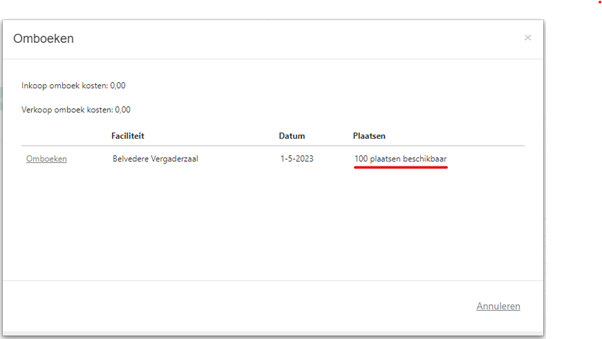 In ons voorbeeld zie je bij de details van de uitvoering in de kolom ‘Plaatsen beschikbaar’ staan dat er nog 100 plaatsen beschikbaar zijn. De capaciteit van locatie Belvedere is immers leidend, en er zijn nog geen inschrijvingen op de twee toegevoegde uitvoeringen op 5 april in de ochtend.