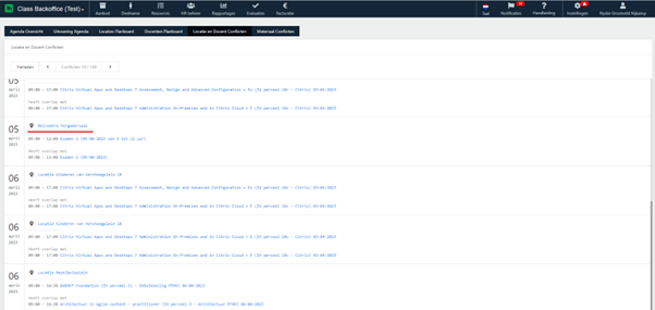 Bij ‘Locatie en Docenten conflicten’ in de resourceplanner zie je de geplande bijeenkomsten voor de twee examens op dezelfde dag, op overlappende tijden bij locatie Belvedere ook terug.