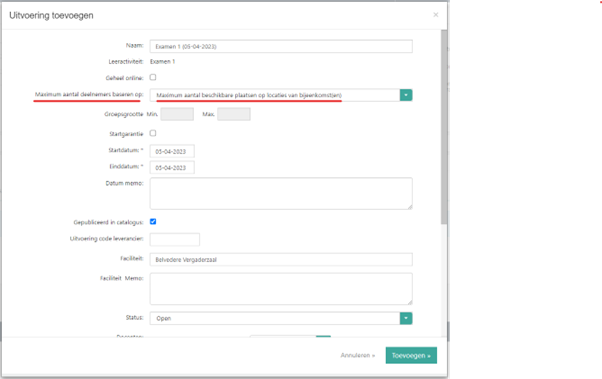 In ons voorbeeld plan je voor Examen 1 een nieuwe uitvoering op 5 april 2023. Bij het toevoegen van de nieuwe uitvoering voor Examen 1, selecteer je bij ‘Maximum aantal deelnemers baseren op’ de optie ‘Maximum aantal beschikbare plaatse op locaties van bijeenkomsten’. Door deze optie te selecteren, is de mimimum maximum groepsgrootte van de uitvoering zelf niet meer van belang. Deze velden kan je niet meer invullen.