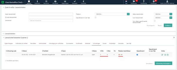 Standaard bestaat in de Class beheeromgeving de mogelijkheid om een minimum en maximum aantal deelnemers voor een uitvoering in te stellen. Wanneer het maximum aantal inschrijvingen is bereikt, kunnen er zowel vanuit het portaal als vanuit de beheeromgeving geen nieuwe inschrijvingen toegevoegd worden.