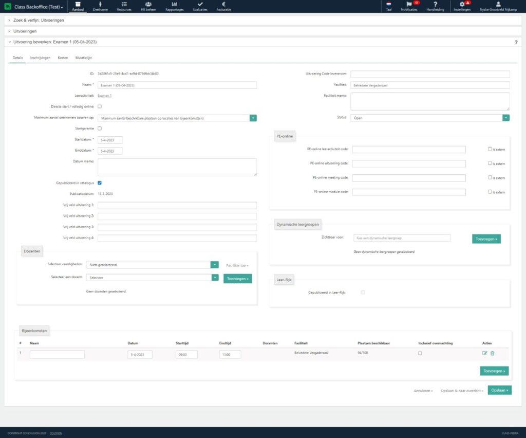 In ons voorbeeld plan je op dezelfde manier voor Examen 2 een nieuwe uitvoering op 5 april 2023. Maak ook 1 bijeenkomst aan van 09:00 – 12:00 op locatie Belvedere.
