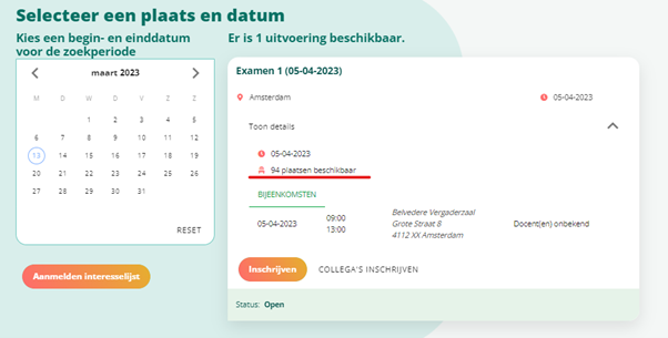 Je ziet nu op het detailscherm van de uitvoering dat er nog 94 van de 100 plaatsen beschikbaar zijn. De capaciteit van de locatie Belvedere is 100. Er zijn 6 inschrijvingen gedaan op de twee examens die plaatsvinden op 5 april in de ochtend die zaal. Dus nog 94 beschikbaar.