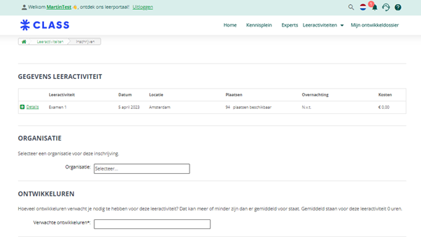 Als dat de waarde ‘Maximum aantal beschikbare plaatsen in uitvoering’ is, is de uitvoering te selecteren in de dropdown ‘Beschikbare uitvoeringen’ zo lang als het maximum aantal deelnemers van de uitvoering nog niet bereikt is.