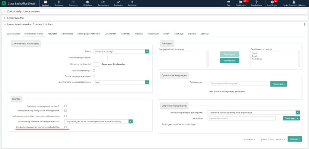 Bij de leeractiviteit kan je instellen dat overboeken mogelijk is wanneer je vanuit de beheeromgeving medewerkers inschrijft op een van de uitvoeringen voor die leeractiviteit. Op het tabblad ‘Publicaties en rechten’ vink je de instelling ‘Overboeken toestaan bij inschrijven via backoffice’ aan als overboeken mag.
