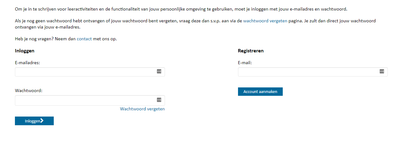 Wanneer de “account registratie” pagina is ingeschakeld om “externen deelnemers” snel en gemakkelijk een opleiding te laten boeken, stop dit proces vaak na het registreren en inloggen. Om te voorkomen dat nieuwe medewerkers vast lopen in het proces is dit nu op elkaar aangesloten, zie onderstaande stappen: